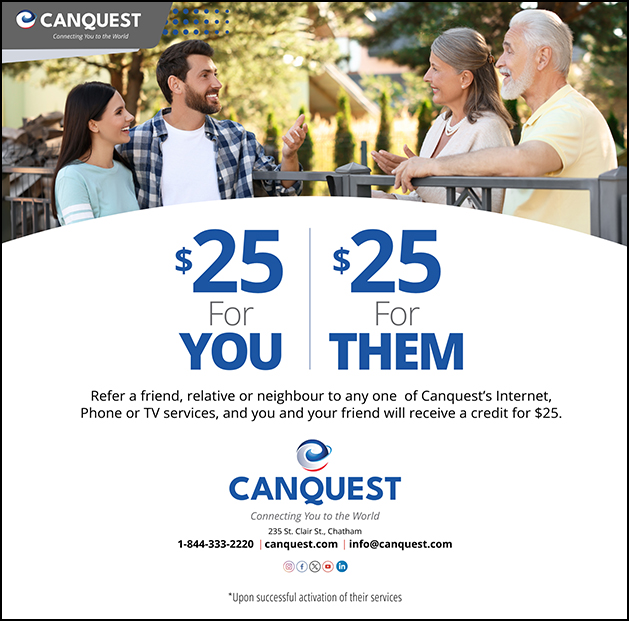 Refer a friend, relative or neighbour to any one of Canquest’s Internet, Phone or TV services, and you and your friend will receive a credit for $25.
